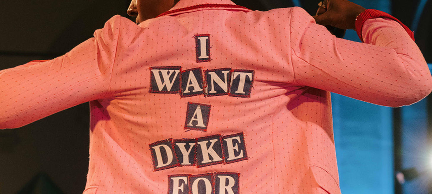 Fi Black, owner of DykeMint, took us through their creative process before the show. Their line, “Butches Contain Multitudes,” was co-created with their wife, Lita. Fi described the throughline of the piece as a desire to expand what butchness means and looks like—particularly using their one-of-one pieces to broaden conceptions of gender expression that typically box butches in.