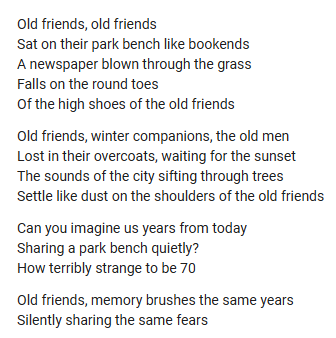 In the illustrious words of Simon & Garfunkel in one of their earliest songs, "Old Friends," "How terribly strange to be 70."